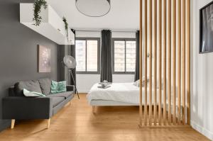 Das kürzlich renovierte Apartment verfügt über ein Schlafzimmer mit einem Einzelbett sowie schallisolierte Wände für zusätzliche Privatsphäre. Zur Ausstattung gehören Heizung, Parkettboden, ein Kleiderschrank sowie eine Sitzecke mit Sofa. Ein Arbeitstisch ergänzt den Raum, Handtücher und Bettwäsche sind inklusive.