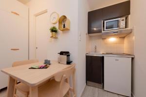 Die voll ausgestattete Küche beinhaltet moderne Annehmlichkeiten wie Kühlschrank, Mikrowelle, Toaster, Wasserkocher sowie Tee- und Kaffeezubereitungsmöglichkeiten neben vollständigem Kochgeschirr für die Zubereitung von Mahlzeiten am Esstisch. Zur Unterhaltung steht ein Fernseher bereit, WLAN ist im gesamten Apartment verfügbar und sorgt so für unterbrechungsfreien Internetzugang während des Aufenthalts.