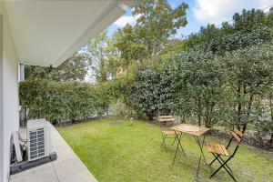 Zu den Einrichtungen vor Ort zählen privater Parkplatz mit barrierefreien Optionen ebenso wie Rauchmelder und Feuerlöscher zur Sicherheit. Das Apartment verfügt über eine möblierte Terrasse zum Essen im Freien mit Blick auf den Garten - ideal zum entspannten Verweilen auf Outdoor-Möbeln. Weitere Annehmlichkeiten umfassen Bügelutensilien (Bügeleisen und -brett), Wäscheständer, Heizung, Schreibtisch, Flachbildfernseher, Kleiderschrank, Waschmaschine, allergikerfreundliche Kissen ohne Federn sowie bereitgestellte Handtücher und Bettwäsche.