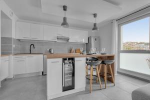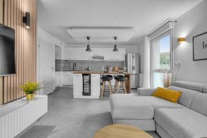 Accommodation features two separate bedrooms alongside a living room furnished with three beds in total. The fully equipped kitchen offers extensive amenities such as a stovetop, refrigerator, dishwasher, oven, microwave and coffee machine as well as kitchenware for meal preparation. The bathroom includes a walk-in shower with no step entry along with shampoo, body soap and a hairdryer for guest convenience.