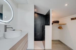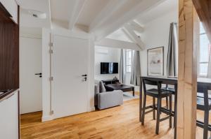 Die Unterkunft umfasst ein Schlafzimmer mit zwei Betten sowie eine voll ausgestattete Küche mit Backofen, Herdplatte, Kühlschrank, Geschirrspüler und kompletter Küchenzeile. Zur Ausstattung gehören zudem ein Sitzbereich mit Flachbildfernseher sowie Annehmlichkeiten wie Klimaanlage, Heizung, Parkettboden und Bügelmöglichkeiten inklusive Bügeleisen und Bügelbrett. Das Badezimmer verfügt über eine bodengleiche Dusche ohne Stufen, Haartrockner sowie Seife für den Körper und Toilettenartikel.