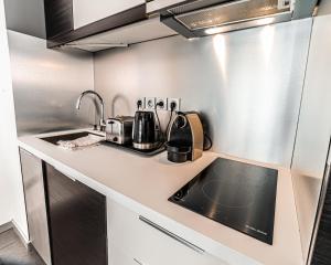 Das klimatisierte Apartment umfasst ein Schlafzimmer mit einem Bett sowie eine voll ausgestattete Küche mit Kochfeld, Mikrowelle, Kühlschrank, Toaster, Kaffeemaschine, Wasserkocher und vollständigem Küchenzubehör inklusive Esstisch. Das Badezimmer ist mit einer stufenlosen Dusche ausgestattet und bietet kostenlose Pflegeprodukte wie Duschgel und Shampoo sowie einen Haartrockner. Weitere Annehmlichkeiten im Zimmer sind Handtücher, Bettwäsche, Bügeleisen mit Bügelbrett sowie Heizmöglichkeiten, zudem steht den Gästen eine Waschmaschine zur Verfügung.